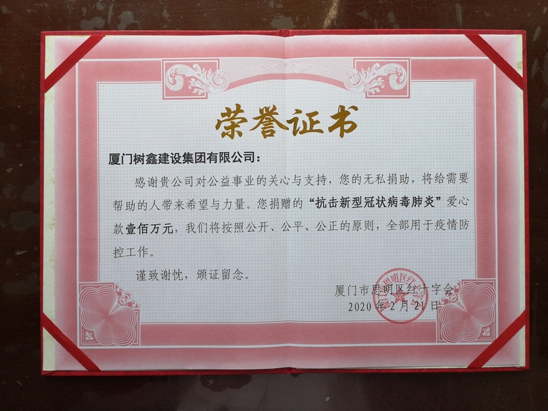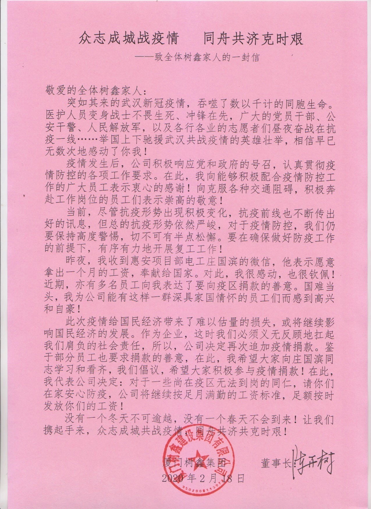 為了支持抗擊疫情,廈門樹鑫集團董事長陳開樹先生表示,守望相助,患難與共是中華民族的精神內核,共同抗擊疫情是集團義不容辭的責任和義務。陳董在第一時間簽發了《致全體樹鑫家人的一封信》,倡議全體員工、各合作單位等積極參與疫情捐款。